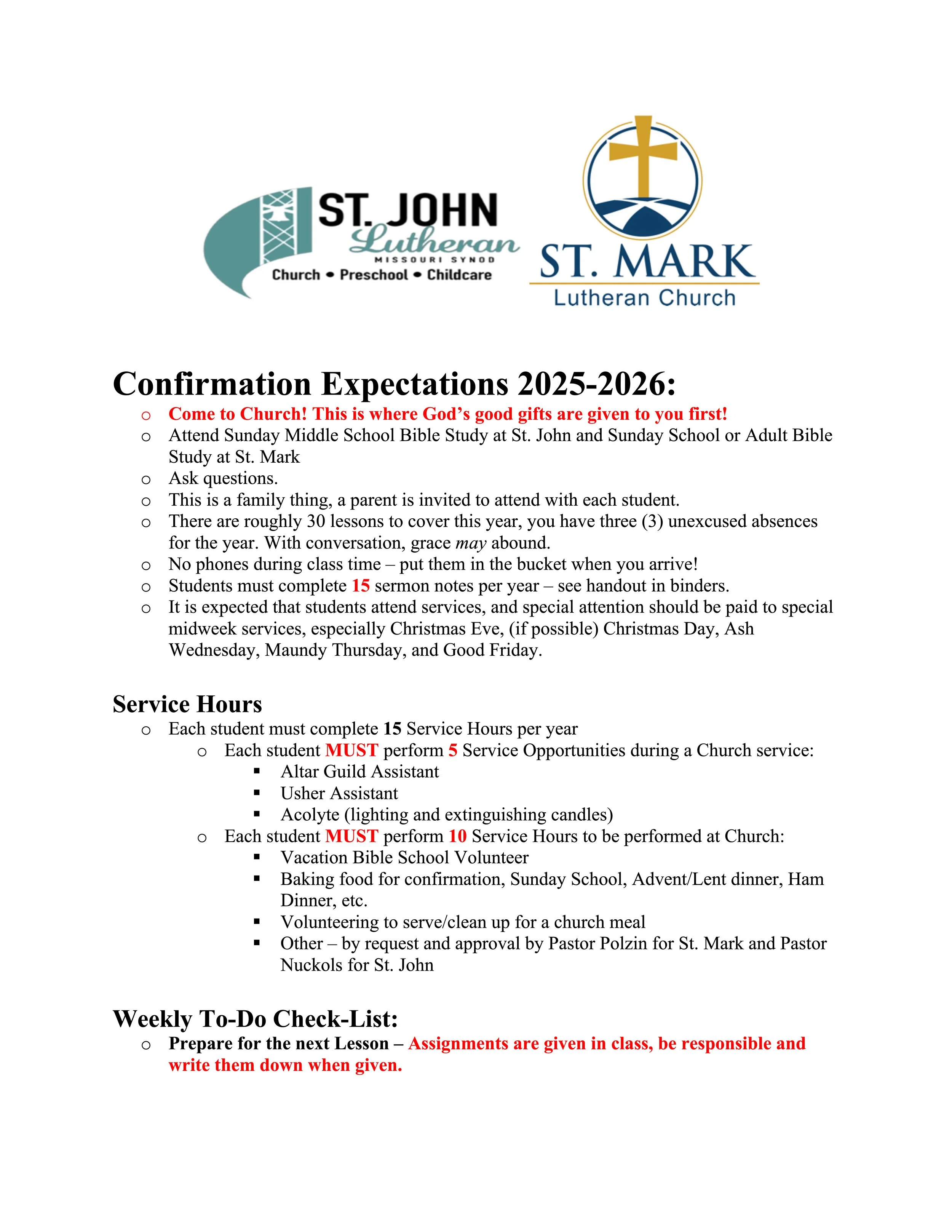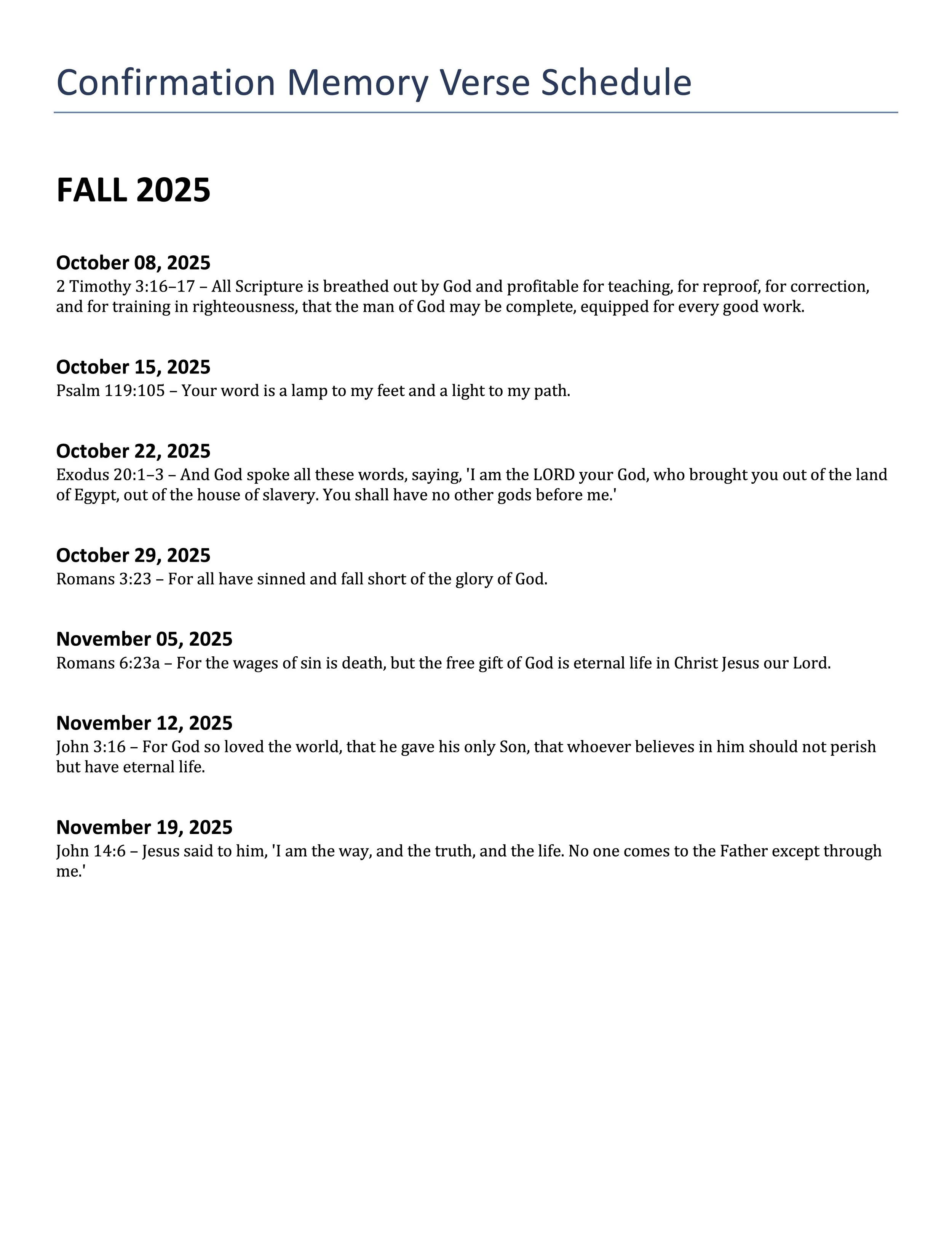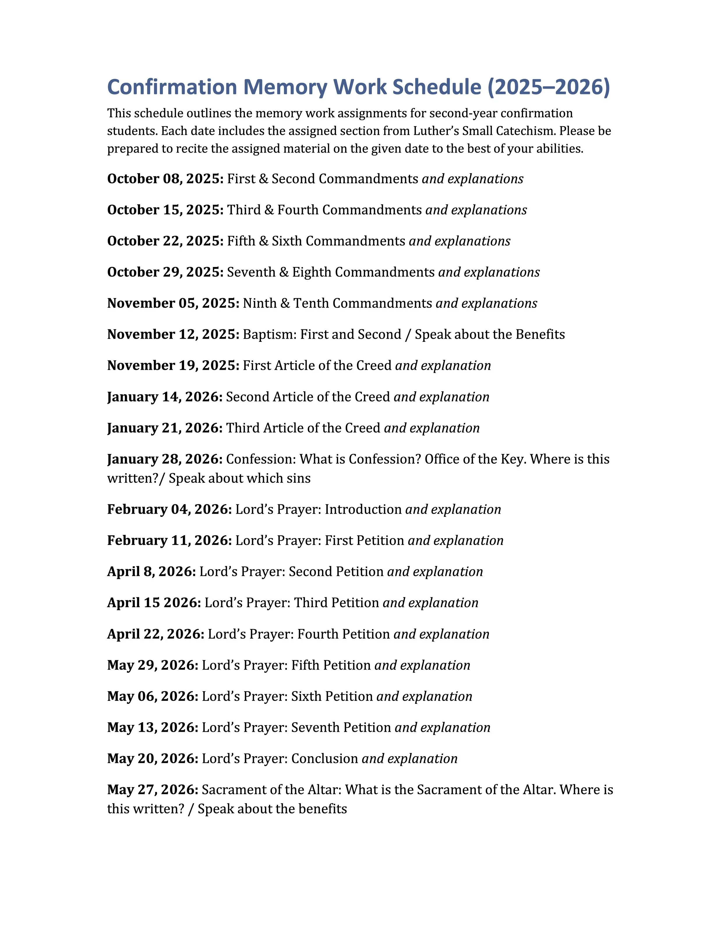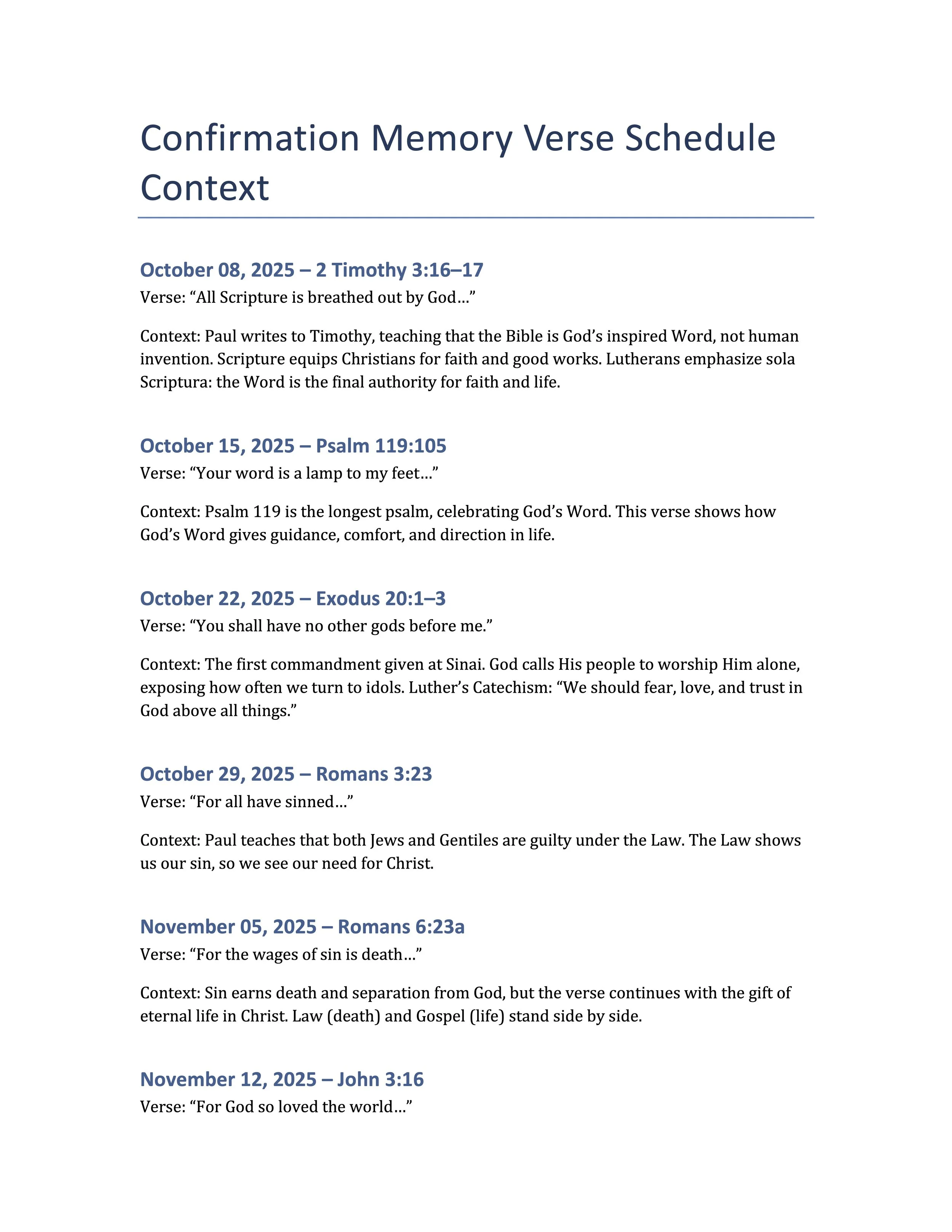 Confirmation Materials Confirmation Expectations 1st Year Memory Verse Schedule 2nd Year Memory Verse Schedule Confirmation Schedule 1st Year Memory Verse Contexts Sermon Notes
